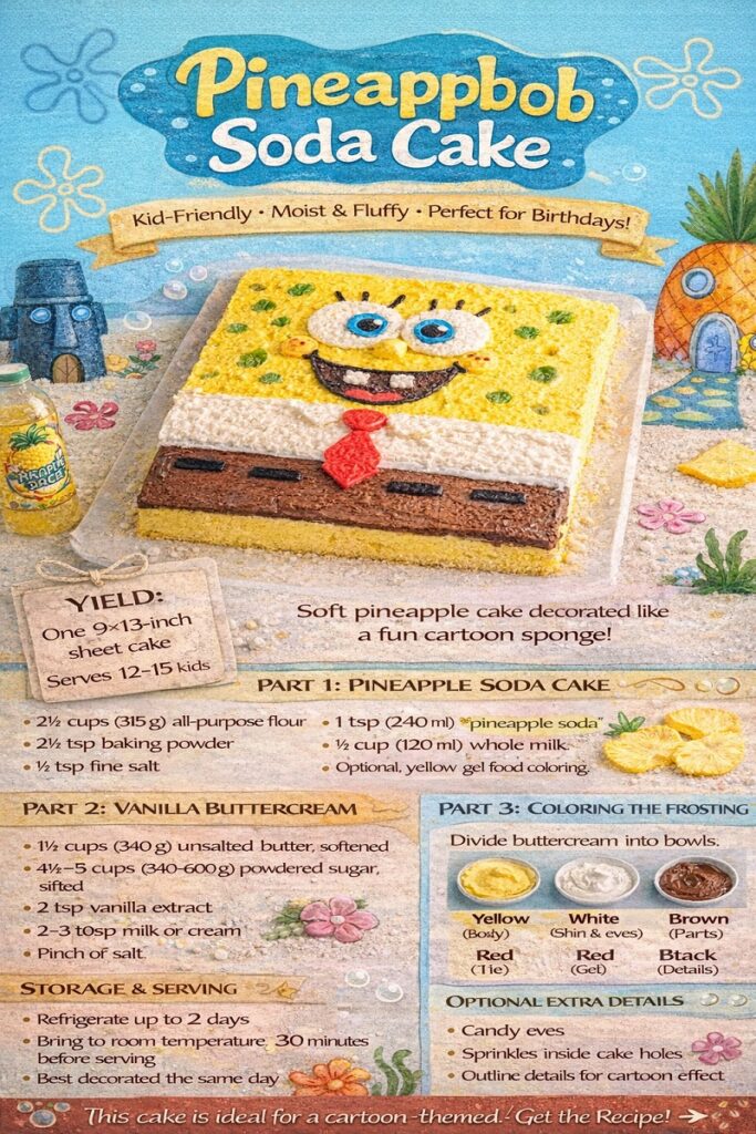 Here’s the recipe for making a “SpongeBob” Pineapple Soda Cake, designed specifically for children’s birthday parties.
