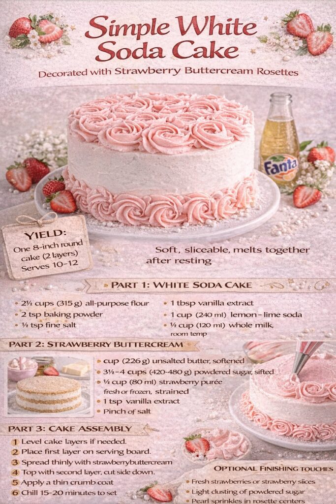 Here is the recipe for a simple white soda cake, followed by clear, step-by-step instructions for decorating it with Strawberry Buttercream Rosette Piping,